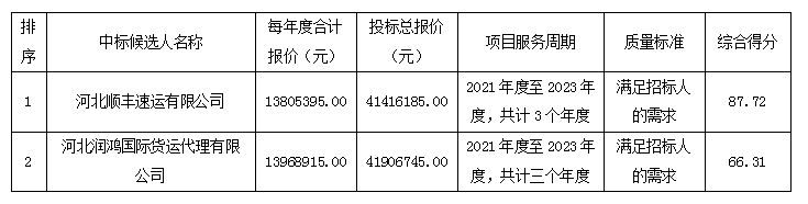 全部投标单位: 中信外包服务集团有限公司、河北润鸿国际货运代理有限公司、河北顺丰速运有限公司
