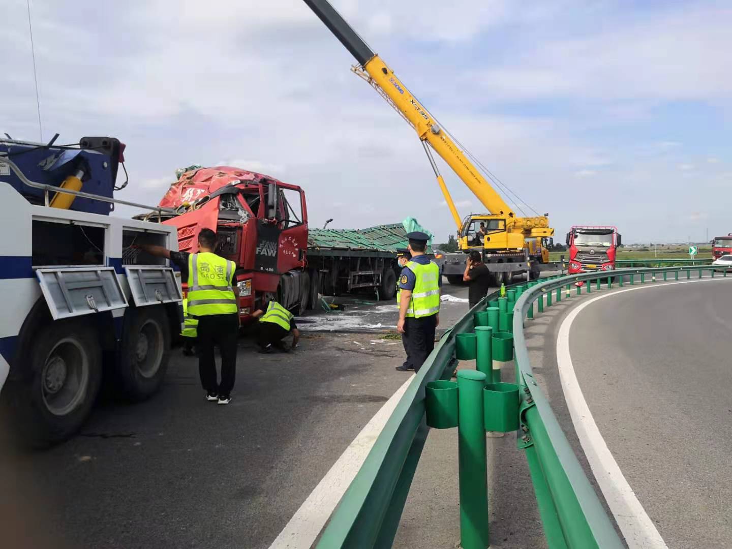 救援公司吊车到达现场后,在路政大队和交警维护交通秩序的配合下,侧翻的货车缓缓起吊,被正立拖移,对散落的货物进行了转运,尽可能减少经济损失。下午7时,现场货物清理完毕,匝道内恢复正常通行。