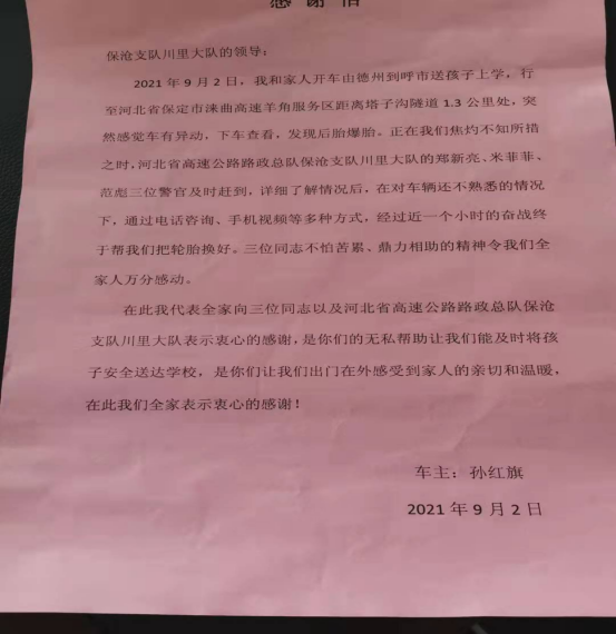 2021年9月6日下午,孙先生夫妇特地来到保沧支队川里大队,为我大队郑新亮、米菲菲、范彪三位路政员送上“危难之时显身手、人民路政为人民”的锦旗以及感谢信,感谢三位路政队员在高速路上帮助其换轮胎一事,同时,对大队工作表达了高度赞扬。