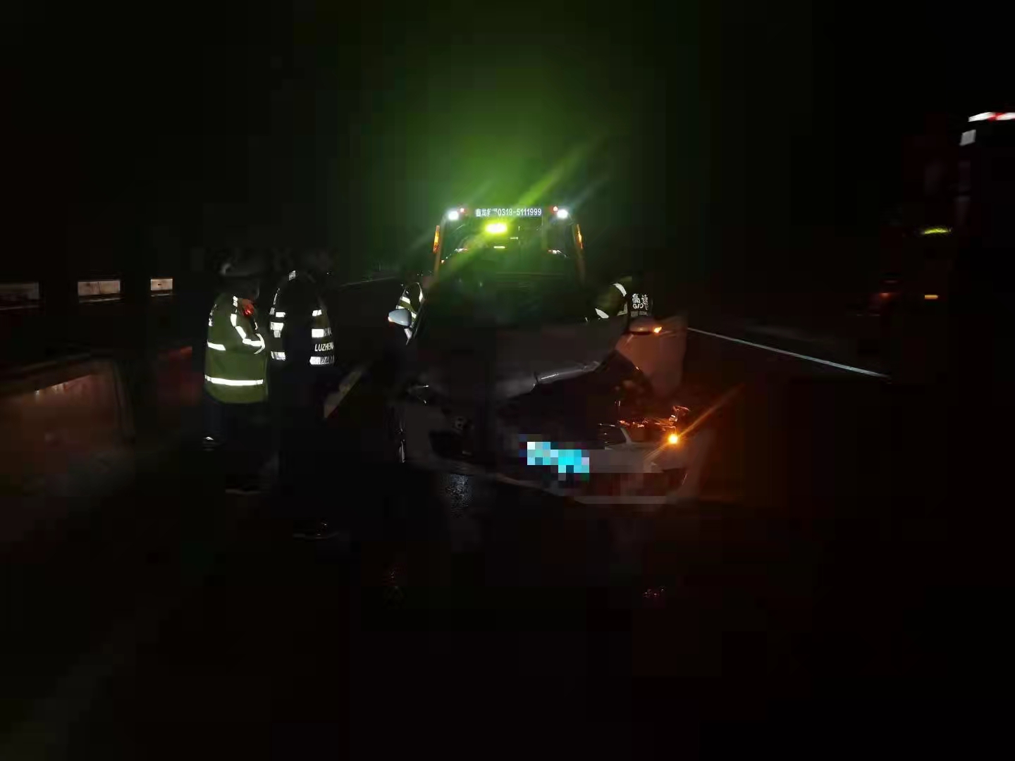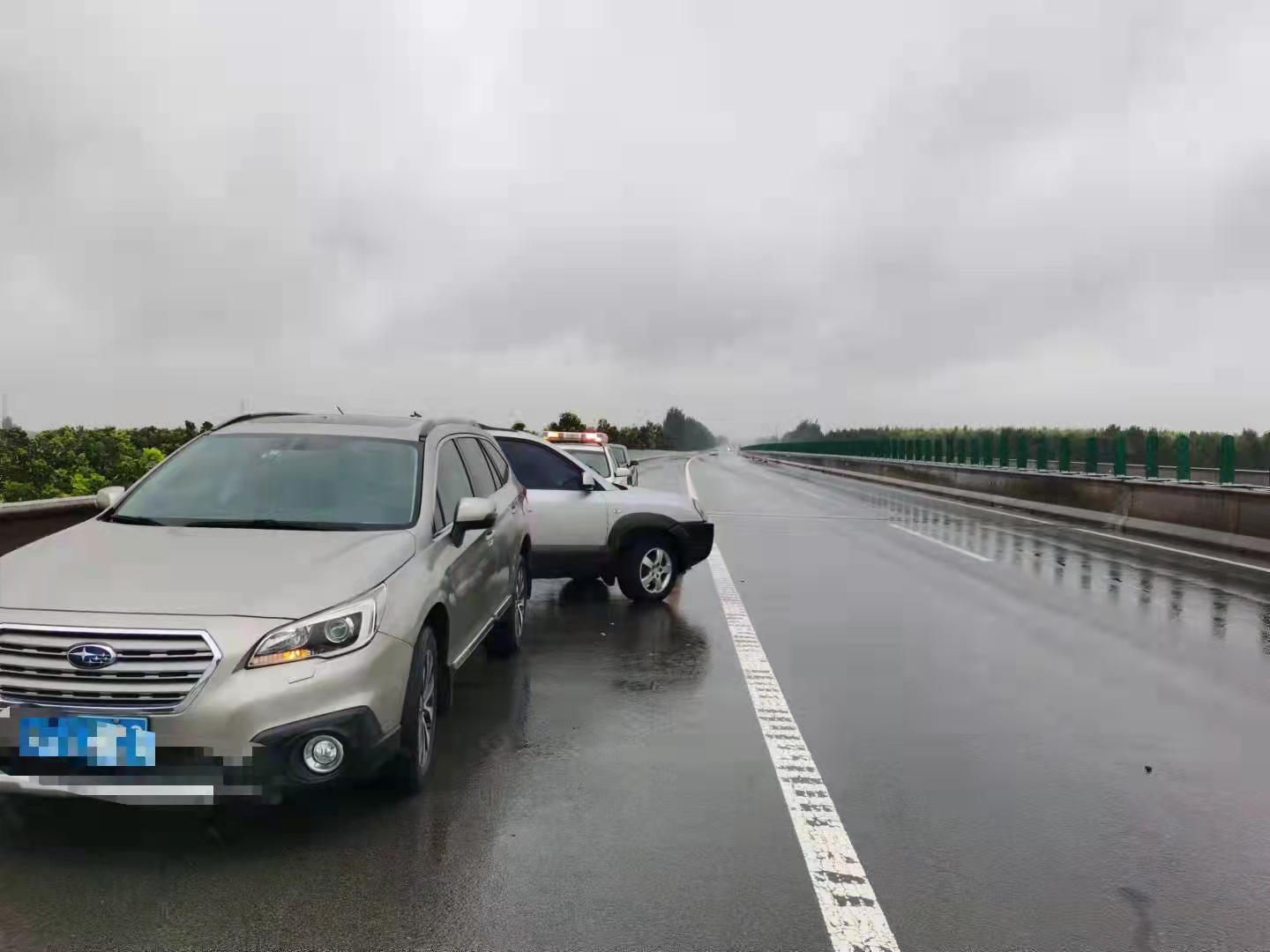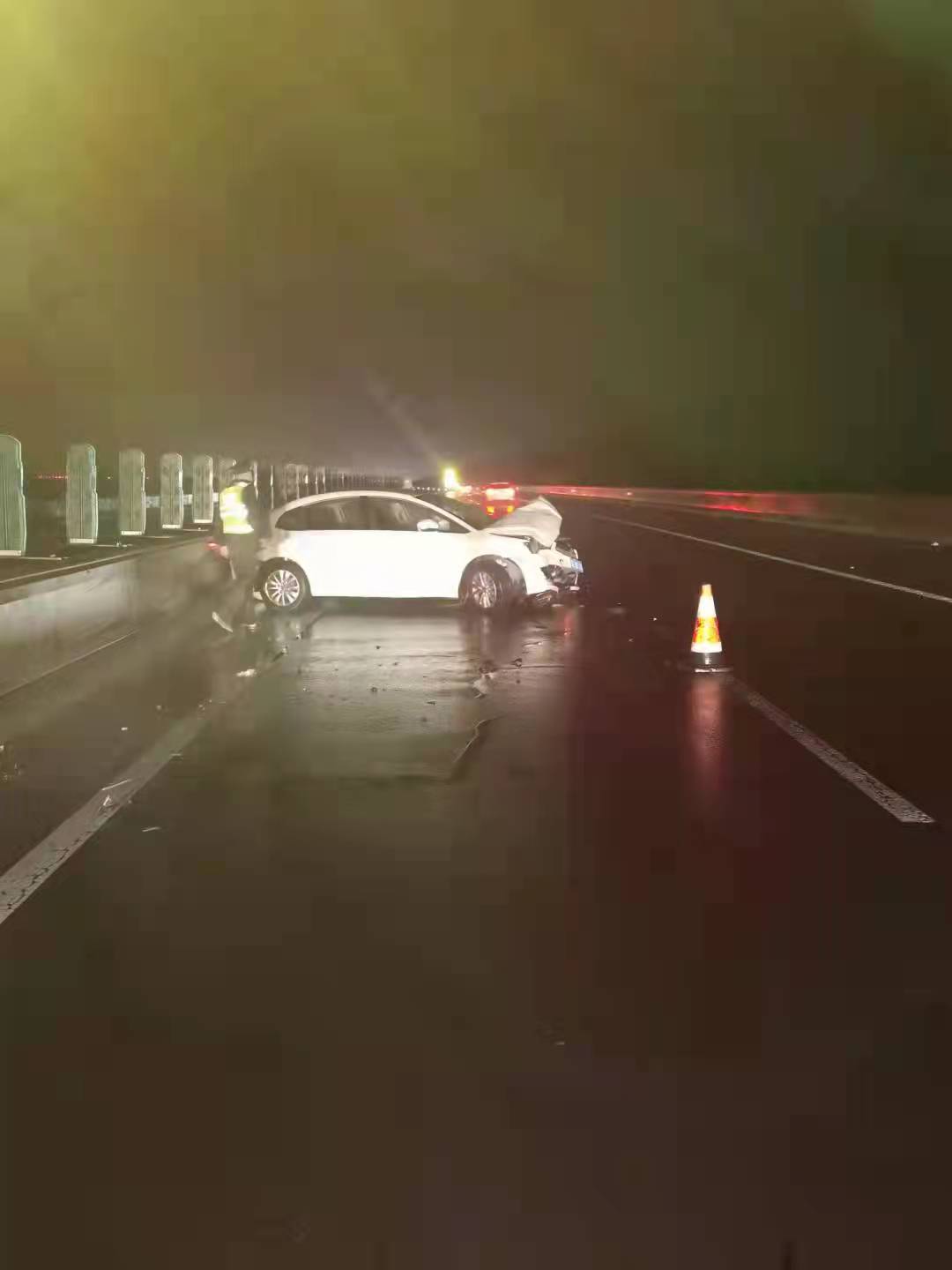 上午10时30分许,一辆轿车在途径邢台方向K44+300公里处时,由于雨天路滑该车驾驶员操作不当,导致车辆发生事故,撞在桥上应急车道桥梁钢筋混凝土护拦,与此同时后面又有一辆轿车避让不及直接追尾。两辆轿车停在应急车辆,不影响车辆通行,无人员伤亡。路政人员接警后,第一时间赶到事故现场,立即报警,为防止二次事故,采取应急措施,设置警示标志,并冒雨配合事故处理交警勘察完现场、救援公司救援事故车辆。在高速交警、救援公司、路政人员的密切配合下,11时25分,车辆救援完毕,事发路段恢复正常通行。