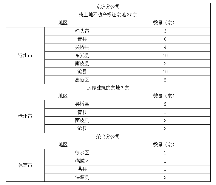 其中,京沪分公司纯土地不动产权证宗地37宗,面积17033.86亩,房屋建筑的宗地7宗,宗地面积合计150.37亩;荣乌分公司6宗土地,面积10111亩。