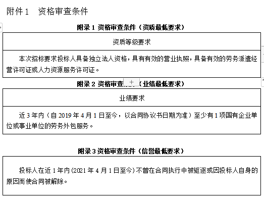 3.1本次招标要求投标人具备独立法人资格,具有有效的营业执照,具备有效的劳务派遣经营许可证或人力资源服务许可证,并在人员、设备、资金等方面具有相应的能力。近3年内(自2019年4月1日至今,以合同协议书日期为准)至少有1项国有企业单位或事业单位的劳务外包服务。