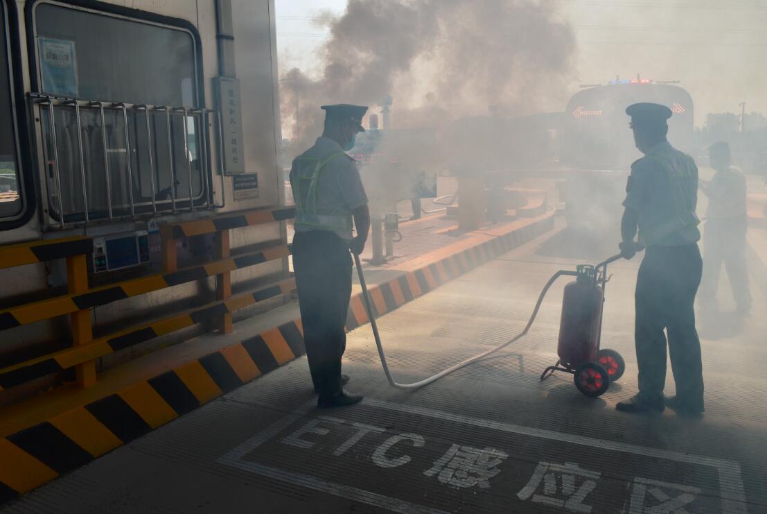 本次演练模拟铜冶收费站无人岗亭发生线路短路导致自燃,形成火灾事故,临近车道收费员发现火情第一时间按照流程上报,随后值班站长、监控等岗位人员按照应急处置设定程序相继完成报警、信息上报,并迅速组织人员开展灭火、封锁现场及疏导过往车辆等工作。最终,火势被完全扑灭,机电人员对设备设施进行了检查修复,站口恢复通行。
