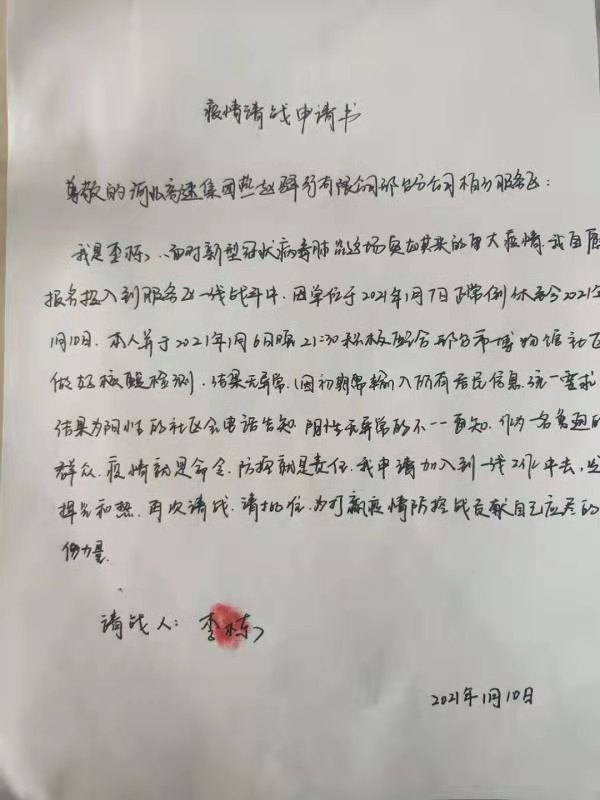 “面对新型冠状病毒肺炎这场突如其来的重大疫情,我自愿报名投入到服务区一线防疫战斗中”。1月10日,燕赵驿行公司邢台分公司收到一封特殊的“来信”--来自柏乡服务区员工李栋的“请战书”。柏乡服务区餐厅主管李栋在完成元旦值班工作后,于1月6日返回家中休假。随着疫情形势逐步严峻,1月7日起邢台分公司所属服务区进行封闭管理,停止人员流动。李栋在家依然牵挂着服务区疫情防控和餐厅的工作,为了能返回岗位加入到服务区防疫工作中,她手写了“请战书”,并庄严地摁上手印,向服务区表达自己返岗参与工作的决心。“我递交过入党申请书,一直都用党员的标准要求自己,在这个特殊的时期,我也想像共产党员那样去战斗!”李栋说。疫情爆发以来,燕赵驿行公司所属各服务区职工自觉停止休假,加入到防疫工作中来,近千名员工坚守岗位,紧抓服务区内部防控的同时,保证正常为司乘提供服务,为抗击疫情贡献力量。