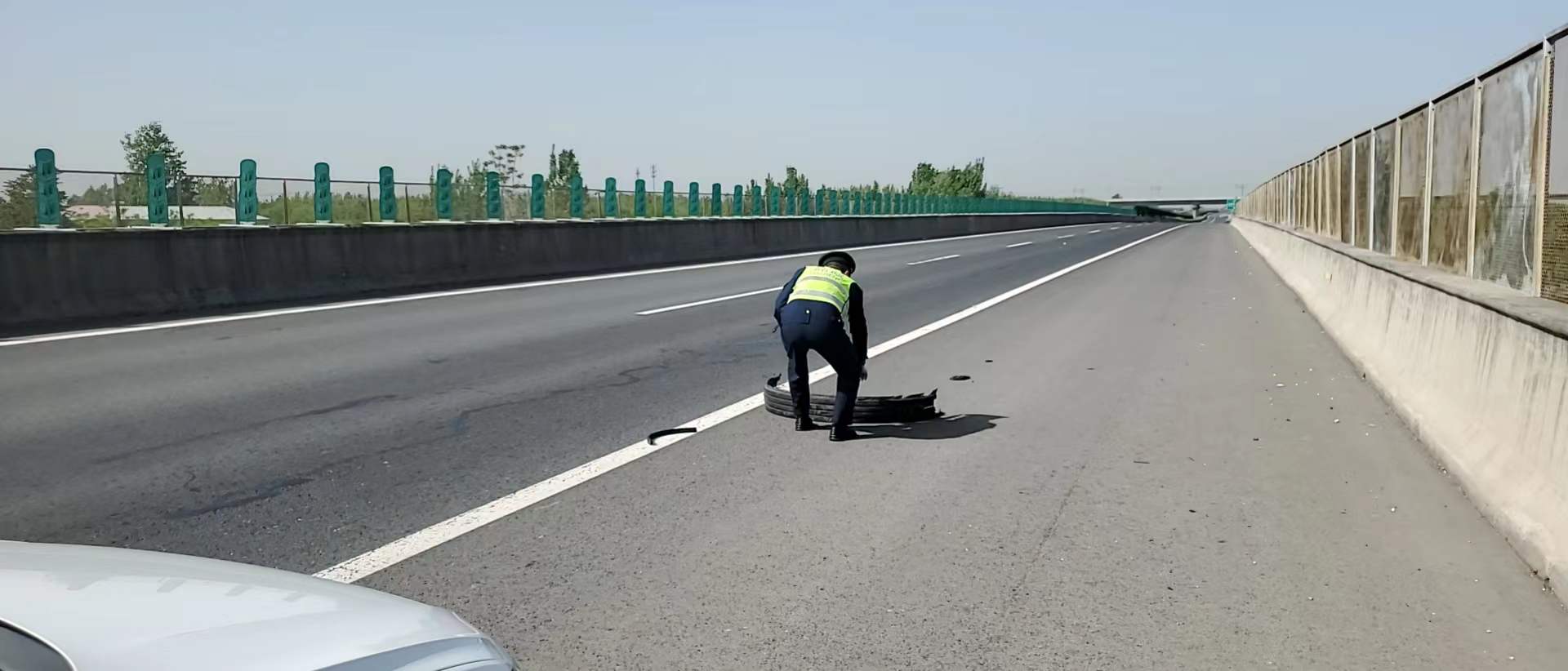 路域环境综合治理——深入开展贯穿全年的安全隐患大排查大整治行动,大队以沿线路基、边坡、边沟、桥隧等位置的杂草、垃圾、抛洒物和沿线损坏、丢失的公路设施、标志标牌等为重点,发现隐患第一时间通知养护工区及时清理修复,消除安全隐患。4月23日上午,当三中队周睿、高亚洲巡查至邢衡高速公路邢台方向K35+700公里处时,发现路面有胎皮,路政人员及时清理,消除安全隐患。