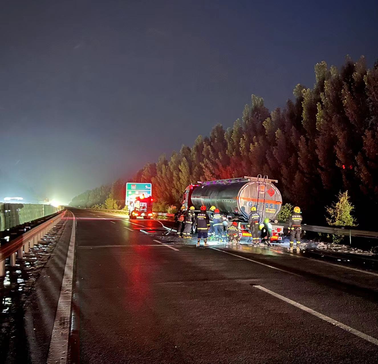 5月18日19时50分,徐水大队值班人员接荣乌分公司荣乌分公司监控中心通知,在荣乌高速山西方向徐水西服务区西行约两公里处,有一辆罐车起火,情形十分危急。徐水大队立即启动应急预案,通知辖区救援公司,值班队长带领外业队员赶赴事故现场。