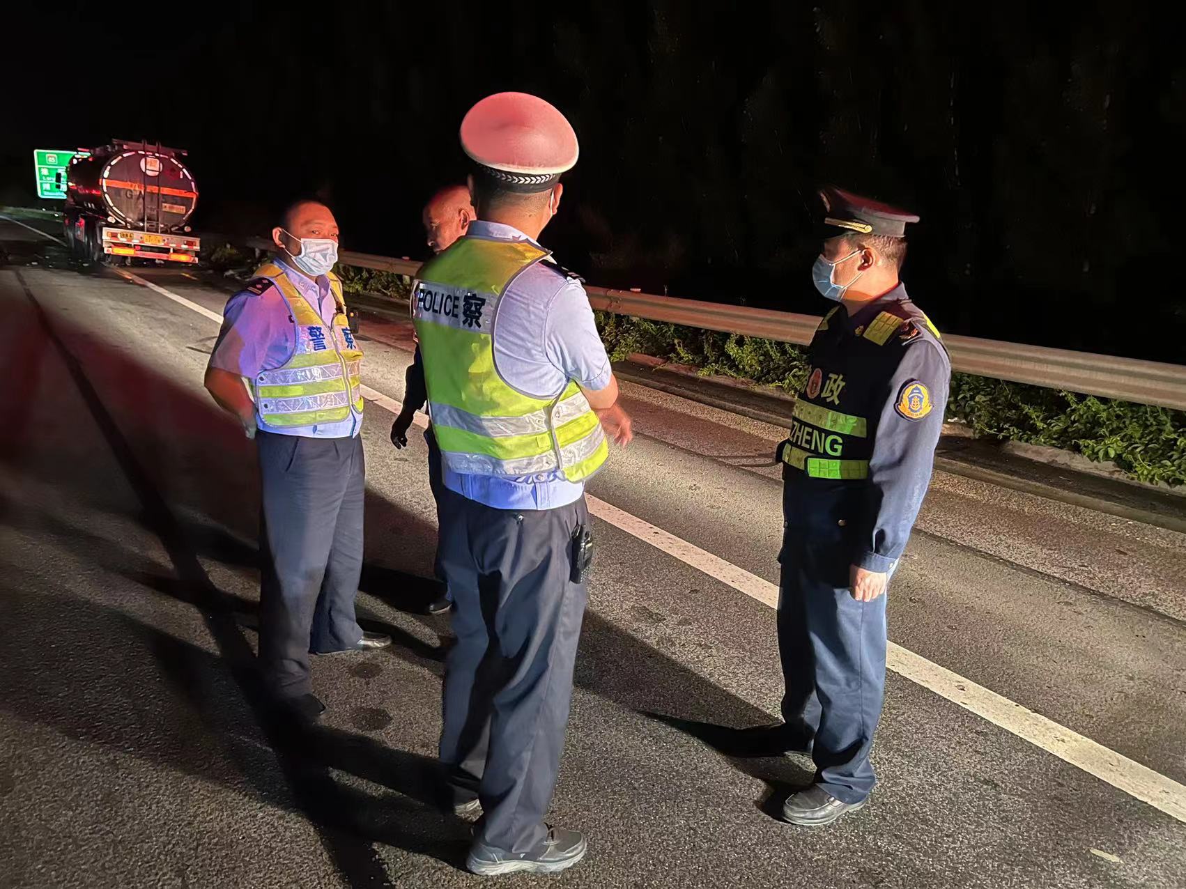 到达现场后,只见前方滚滚浓烟,火势凶猛。为确保过往车辆行车安全,路政人员迅速设置警戒区域,进行现场管控,于起火现场远端进行事故预警工作。在消防救援人员灭火期间,大队值班队长蔡仁诚同高速交警、养护工区、救援公司相关单位商讨后续处置方案。20时23分,火势被彻底扑灭!经初步勘察,起火位置为汽车右后轮胎,由于救援及时,未发生罐体爆炸和人员伤亡事件。5月19日凌晨1时,在多部门协同施救下,起火车辆驶离事故现场,管制解除,交通恢复正常。