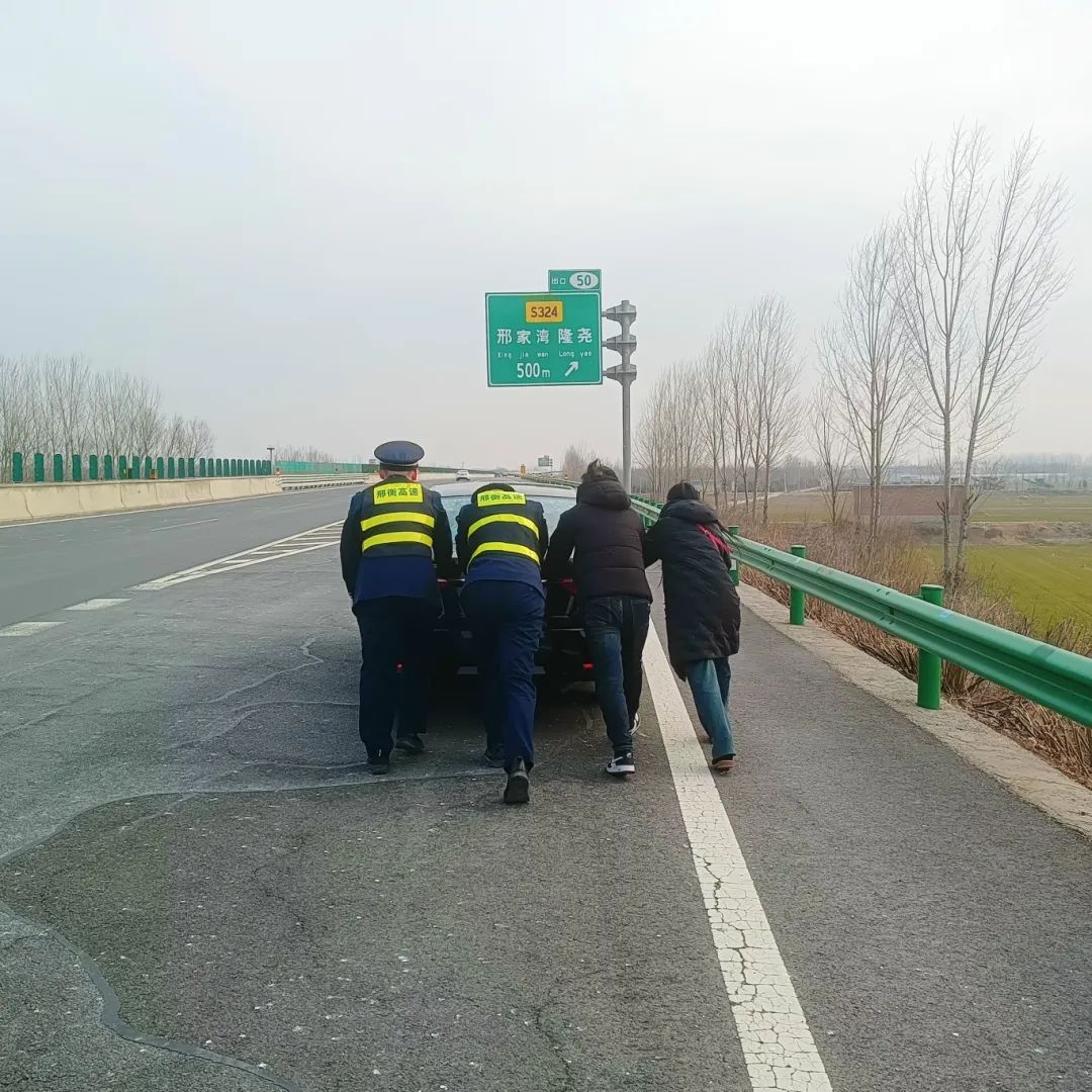 虽然是小轿车,但由于深夜天气较冷,刘先生一人推车仍有些吃力,速度较慢,且有一定的安全隐患。班长见状连忙和疏导员分工合作,一人在车辆后方用指挥棒预警引导后方来车注意避让,一人帮助刘先生推车,先后交替作业,帮助刘先生推行约1.2公里,到达站口充电站成功充电。
